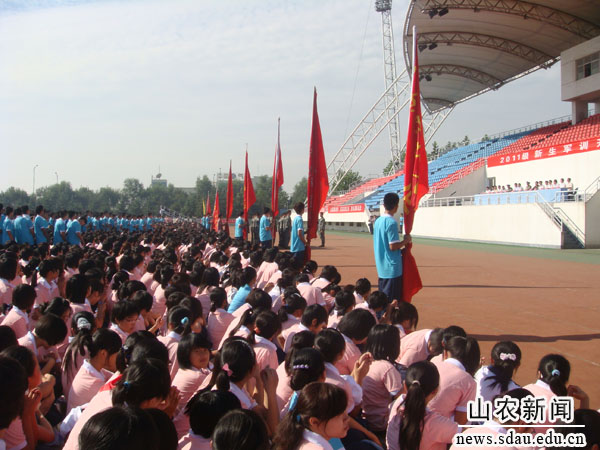 9月6日上午,南校区和东校区体育场彩旗飘舞,军歌嘹亮,2011级新生军训开营式隆重举行。全体2011级新生身着统一服装,以饱满的精神、昂扬的状态迎接军训的开始。