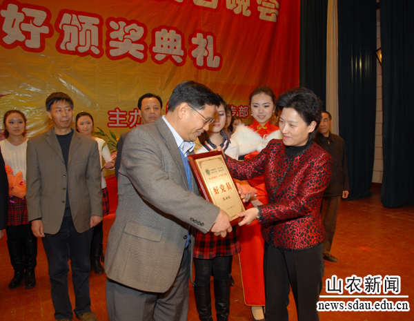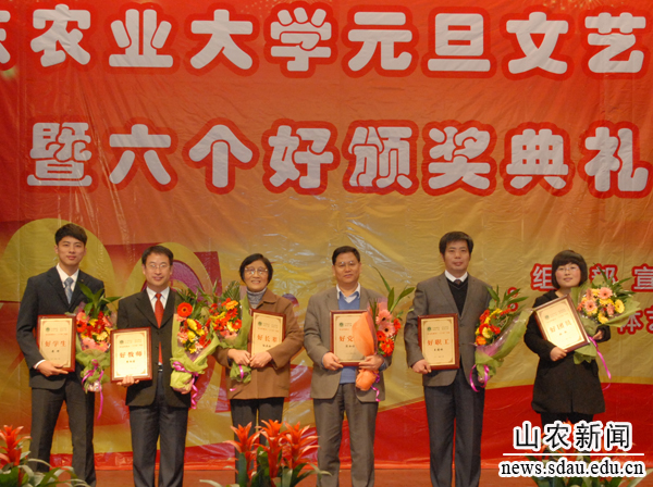 节目中间的“六个好”颁奖典礼一次次把晚会的热烈氛围推向高潮。第二届“身边的感动――六个好”评选活动,是围绕KY官网创先争优、争做科教兴农先锋而开展的一项重要活动。在创先争优活动中,各基层党委高度重视,广大党员积极参与,奋发向上,求真创新,涌现出一大批优秀团队和个人,此次受到表彰的“六个好”就是他们中的优秀代表。“身边的感动――六个好”评选活动得到全校师生的热烈响应,大家踊跃投票,推荐身边的榜样。经过网络投票、现场投票,最后,泰山学者孔令让教授获得好党员称号、外国语学院学生张敏获得好团员称号、植保学院李向东教授获好教师称号、体艺学院学生黄帅获好学生称号、经管学院办公室副主任王园林获好职工称号、农学院退休教授孙兰珍获好长辈称号。另外54名正式候选人获得提名奖。校领导依次走上主席台,向获奖者颁奖、祝贺,合影留念。