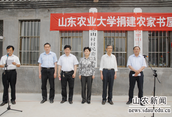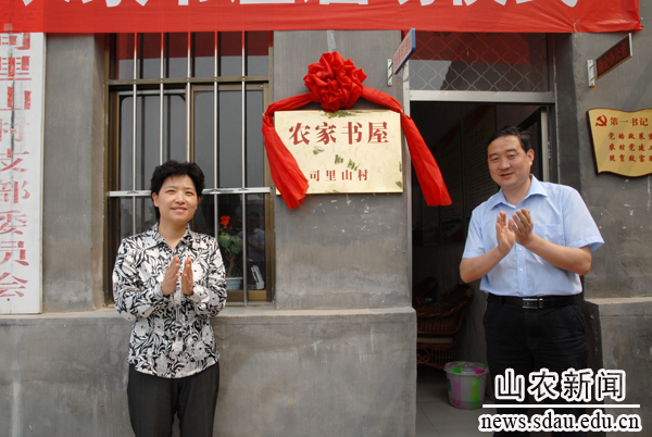 东平县委常委、组织部长周民,东平县副县长臧玉海,戴庙镇党委书记郭芮,镇长范诗安陪同农大领导和专家考察座谈,邢善萍和周民共同为农大援建的“农家书屋”揭牌。