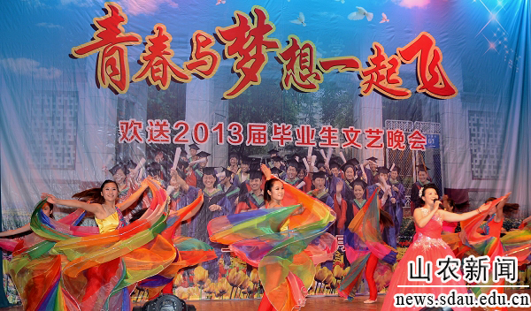 六月,栀子花开,离别的季节,带着淡淡的伤感和深深的留恋,六月,毕业生们即将带着微笑与祝福,奔向更广阔的海洋。晚会在充满激情与活力的开场舞《舞动青春》中拉开帷幕,放飞青春梦想的动感和力量带动起全场观众的热情。女声独唱《中国梦》唱出了农大人的积极向上的生活态度,将农大人干事创业精神风貌表现的淋漓尽致。藏族舞蹈《翻身农奴把歌唱》用欢快的节奏、动感的舞姿表达了对伟大祖国的祝福和对幸福生活的憧憬,激起了全场观众热烈的掌声,将晚会推向一个高潮。党团干部联唱《想家的时候》、《要问我们想什么》更是深深表达了学校领导、老师对毕业生祝福与不舍之情,更是将晚会推向了一个新的高潮,丰富多彩的节目为观众奉献了一场无与伦比的视觉盛宴。笛子独奏《扬鞭催马运粮忙》让观众领略了民族器乐的魅力;男女二重唱《风吹麦浪》抒发了对大学生活难以割舍的情怀;舞蹈《跳吧跳吧》充满大学生朝气蓬勃的青春气息;音诗诵《青春的使命》、健美操“飞得更高”、歌曲《毕业歌》表达了青年学子牢记祖国重托,用青春与梦想开创一片新天地的豪情壮志。