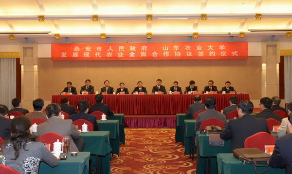 温孚江在签约仪式上致辞。他说,农大的发展,与农大人的辛苦、努力密不可分,更离不开泰安人民的关心和支持。学校与泰安市一直保持着密切的合作关系,学校的专家教授在科技推广服务过程中,与泰安干部群众建立起了鱼水深情。小麦专家余松烈院士致力于小麦精播高产栽培技术研究与示范,尽管近年来年事已高,体弱多病,仍然坚持在泰安推广小麦宽幅播种高产技术。畜牧专家李铁坚老师担任岱岳区科技副区长13年,牵线搭桥,推广科技;退休后,仍然牵挂着岱岳区科技和畜牧业的发展。学校有大量的成果在泰安得到转化和推广示范,于振文院士研究和推广的小麦氮素后移高产栽培技术,在岱岳区创下万亩小麦高产示范片平均亩产679公斤的全国记录。束怀瑞院士针对近年来肥城桃品质下降、效益下滑的现状,用自己的科研经费支持老师们开展肥城桃精品生产技术体系研究与示范,精品果率大幅度提升,经济效益显著提高。董树亭教授推广夏玉米直播晚收高产栽培技术,在岱岳区创下玉米单产1127公斤的北方夏玉米单产纪录。农大在泰安办学的五十多年,泰安市就是教学、科研、实习的基地。此次双方签订的合作协议,涵盖的范围更加宽泛,包括了种植、养殖、林业、水利、农业机械化、农产品加工、生态环境、农村经营管理、农业科技服务等诸多领域。希望学校有关部门与泰安市相关部门和人员,认真抓好落实,充分利用好双方的资源和优势,组织好每一个合作项目的实施,努力办成校地合作的典范。