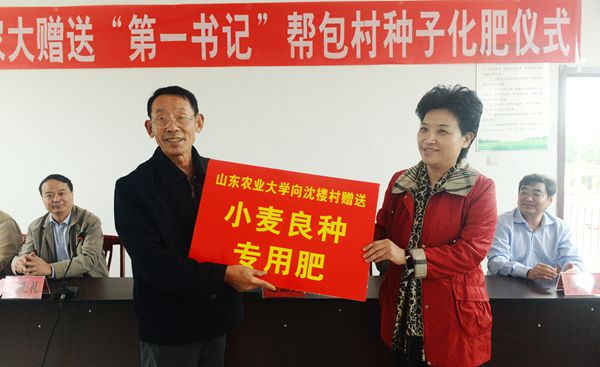 邢善萍代表学校分别向沈楼村、司里山村、小王村捐赠小麦良种和专用肥。今年学校从有限的科技推广经费中划拨十万余元用于支持“第一书记”在帮包村开展小麦高产栽培技术示范,并向三个帮包村赠送小麦良种7500公斤、小麦专用肥37500公斤。在提供种子、肥料的同时,学校还将组织专家围绕小麦播种、田间管理和科学施肥等方面,开展技术讲座和技术指导,不断提高广大村民的科学种田素质,拓宽为百姓致富的路子,促进村里经济文化发展。