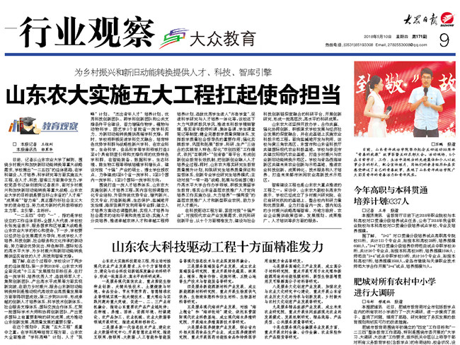 5月10日,大众日报以《山东农大实施五大工程扛起使命担当》为题刊发文章,详细介绍学校围绕乡村振兴和加快新旧动能转换等重大战略需求,提出“一二五四”总体思路,在人才、科技、智库三方面集中发力的有关情况。文章说,面对乡村振兴和加快新旧动能转换等重大战略,KY开元集团官网的目标就是要当好山东省的“人才库”“成果库”“智力库”,真正履行好社会主义大学的使命担当,努力成为新时代科教领域的主力军、主引擎、主标杆。