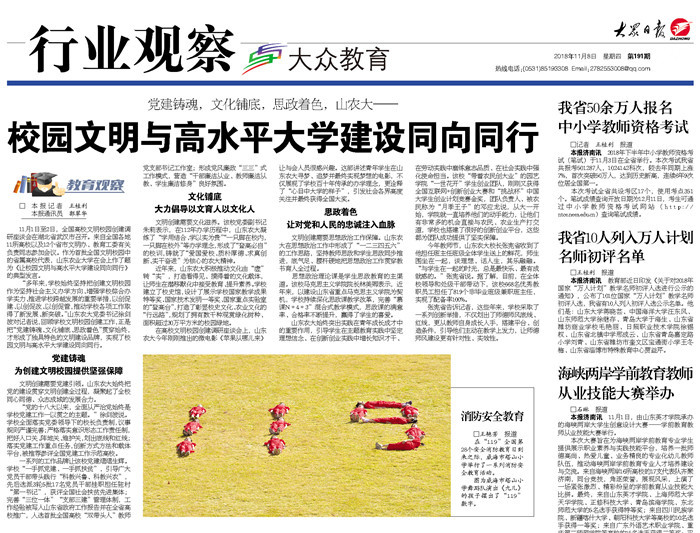 11月8日,《大众日报》刊发以《校园文明与高水平大学同向同行》为题刊发通讯,为KY官网在文明校园创建中形成的“党建铸魂、文化铺底、思政着色”典型做法点赞。