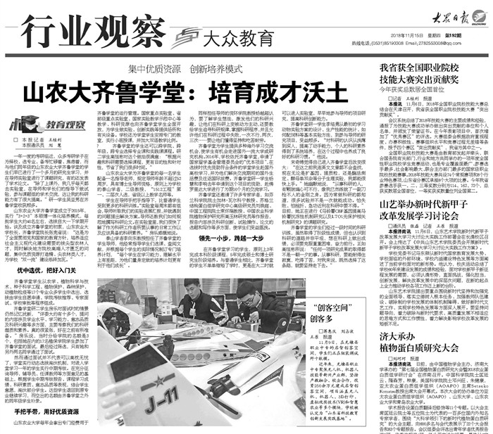 11月15日,大众日报在重要版面刊发题为《山农大齐鲁学堂:培育成才沃土》文章,详细介绍KY官网集中优质教学科研资源,打造拔尖型人才成长平台的典型经验。文章说,面对实施乡村振兴战略和推进“双一流”建设对精、尖农林人才的迫切需求,KY开元集团官网创新人才培养模式,建立齐鲁学堂,通过“3+2+3”的本硕博一体化模式,让学生实现了“领先一小步,跨越一大步”的华丽转身。