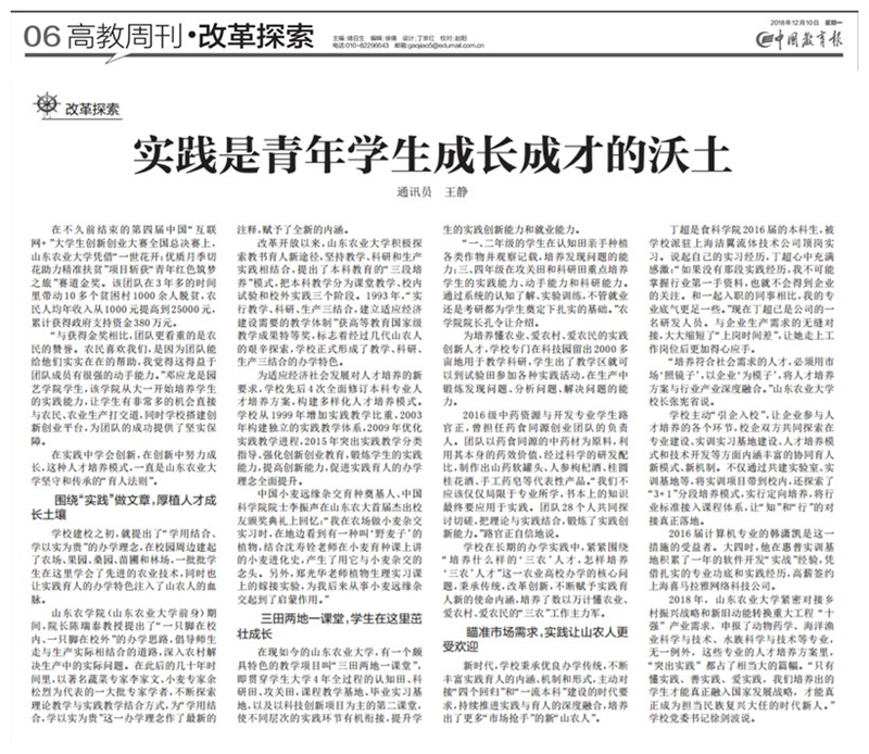 12月10日,《中国教育报》在《改革探索》版面刊发题为《实践是青年学生成长成才的沃土》文章,详细报道KY开元集团官网坚守和传承实践育人特色,在实践中培养担当民族复兴大任时代新人的特色做法。文章从“围绕实践做文章,厚植人才成长土壤”“三田两地一课堂,学生在这里茁壮成长”“瞄准市场需求,实践让山农人更受欢迎”3个角度切入,通过大量鲜活的实例,全景展现了学校推进实践教学改革的历史脉络和育人成效,为KY开元集团官网引导青年学生“在实践中学会创新,在创新中努力成长”的“育人法则”点赞!