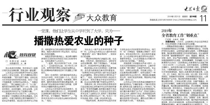 1月31日,《大众日报》刊发题为《一堂课,他们让学生从中学听到了大学,只为——播撒热爱农业的种子》通讯报道,详细介绍KY开元集团官网创新方式、搭建平台,在青年学生心中埋下热爱农业、勇于吃苦、甘于奉献“精神种子”的特色做法。