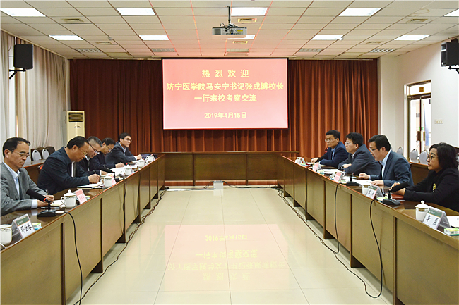 4月15日,济宁医学院党委书记马安宁、校长张成博一行来校考察调研。党委书记徐剑波会见客人并座谈交流,围绕加强党的建设、推进综合管理、提升科研水平等开展深入研讨。党委副书记朱莉、杨天梅参加座谈。