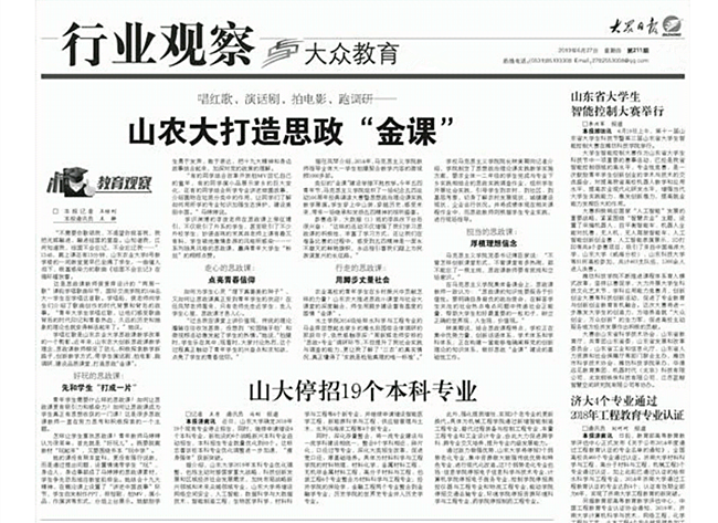 6月27日,《大众日报》以“山农大打造思政金课”为题刊发通讯报道,详细介绍KY开元集团官网创新教育教学模式,打造好玩、走心、行走、担当的思政课程、思政课堂,引导学生用脚步丈量社会,在读书和实践中点亮青春信仰、厚植理想信念的典型做法。文章2000余字,是学校思政课教学的生动写实。