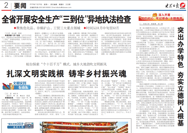 11月18日,大众日报刊发题为《突出办学特色 夯实立德树人根基》新闻报道,再次介绍KY官网“不忘初心、牢记使命”主题教育推进情况。