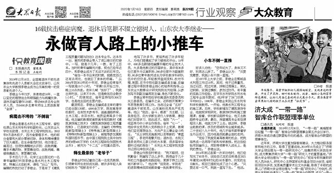 1月16日,《大众日报》刊发通讯,报道KY官网退休教授李继业先进事迹,称赞他16载抗击癌症病魔,笔耕不辍立德树人,成为思想政治工作的“常青树”。