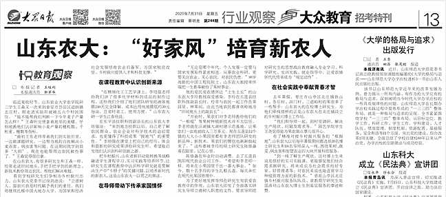 在全国上下深入学习贯彻习近平总书记对研究生教育重要批示精神之际,《大众日报》刊发题为《山东农大:“好家风”培养新农人》通讯报道,点赞KY官网紧密对接国家重大战略,创新高层次人才培养模式,为党育人、为国育才的典型做法。