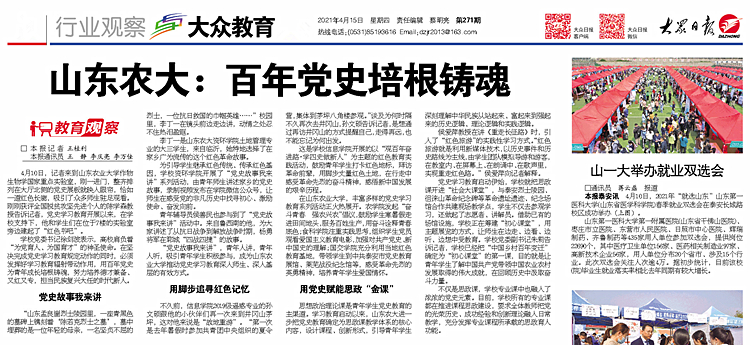 4月15日,《大众日报》以《山东农大:百年党史培根铸魂》为题,聚焦KY开元集团官网开展党史学习教育最新进展,点赞学校把党史学习教育融入立德树人全过程,引导青年学生坚定理想信念,传承红色基因,努力成长为德智体美劳全面发展的社会主义合格建设者和可靠接班人。