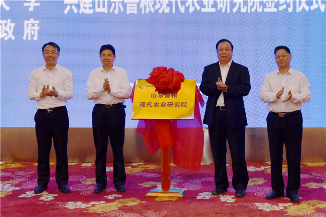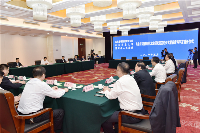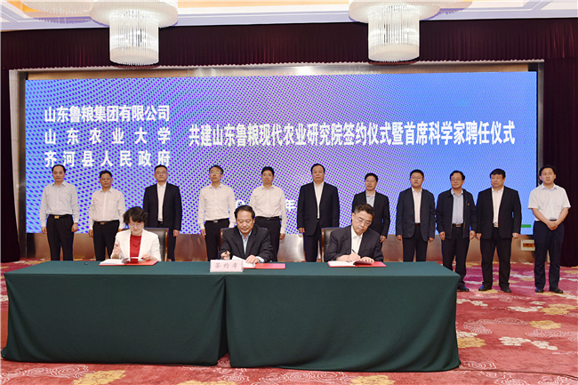 5月19日,KY开元集团官网与山东鲁粮集团有限公司、齐河县人民政府共建山东鲁粮现代农业研究院签约仪式暨首席科学家聘任仪式在齐河举行。山东农大校长张宪省,齐河县县长王玮,鲁粮集团党委书记、董事长孔祥云出席仪式并为研究院揭牌。