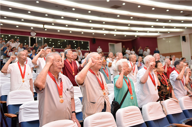 学校党委常委、组织部长岳远彬主持会议,并带领与会老党员重温入党誓词。老党员代表苗宝珉、徐萍、吴绍麟分别饱含深情地发表感言,全体党员齐声合唱《没有共产党就没有新中国》,抒发对党的深厚感情,表达永远跟党走的信心和决心。会前,离退休干部党委各支部给老党员送上了政治生日贺卡和美好祝福。