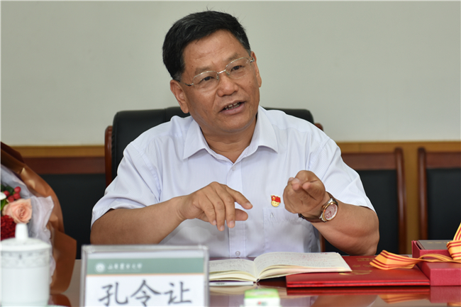 孔令让回顾了赴京参会的情况,讲述了在天安门广场聆听习总书记讲话的心情和感触。他说,此次赴京参加“七一”庆祝活动,感到无比光荣、无比自豪;现场聆听习近平总书记重要讲话,更深切地感受到党的光荣与伟大,感受到伟大祖国的欣欣向荣,感受到国家和人民的强大力量,心灵受到极大震撼,经历了一次精神洗礼。