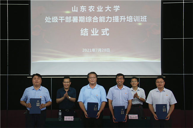 结业式上,徐剑波为参训学员代表颁发结业证书,要求大家深化培训成果,将培训所学转化为发扬斗争精神、应对风险挑战的能力本领,转化为推动高质量发展、奋力开拓新局的实际成效。他强调,作为学校中层骨干力量,各位学员肩负着推动学校高质量发展的重要使命,要坚守梦想、满怀信心,在学校党委的坚强领导下,始终同师生群众想在一起、干在一起,风雨同舟、同甘共苦,朝着我们梦想中山东农大的样子凝神聚力、奋勇攀登;要斗志昂扬、抢抓机遇,认清形势与现实,弘扬和践行山农精神、山农基因、山农品质,增强推动改革发展的志气、骨气、底气,在服务国家、服务人民中创造经得起实践、师生和历史检验的工作业绩;要奋勇争先、脚踏实地,发扬为民服务孺子牛、创新发展拓荒牛、艰苦奋斗老黄牛精神,以立德树人为根本、以强农兴农为己任,巩固好学校在山东省高校、在全国高等农业院校中的地位,维护好学校改革发展所取得的各项成就,以实际行动践行初心使命,为学校争取新的更大光荣。