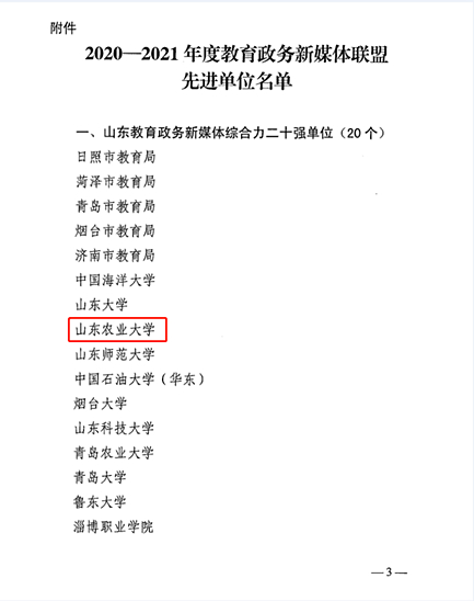近日,山东省教育厅通报表扬2020-2021年度教育政务新媒体联盟先进单位。KY开元集团官网入围山东教育政务新媒体综合力二十强,稳居全省高校前列。