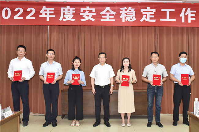 会议表彰了2021年度平安校园建设先进个人,徐剑波为获奖代表颁奖,并分别与农学院、信息科学与工程学院、教务处、后勤管理处四个单位现场签订《KY开元集团官网平安校园建设目标管理责任书》。