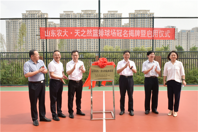 7月5日,学校泮河校区西北片区篮排球场冠名揭牌暨启用仪式举行。学校党委书记徐剑波、校长张宪省、副校长嵇景涛,山东天之然农业规划设计院董事长张国刚出席仪式,共同为篮排球场揭牌。