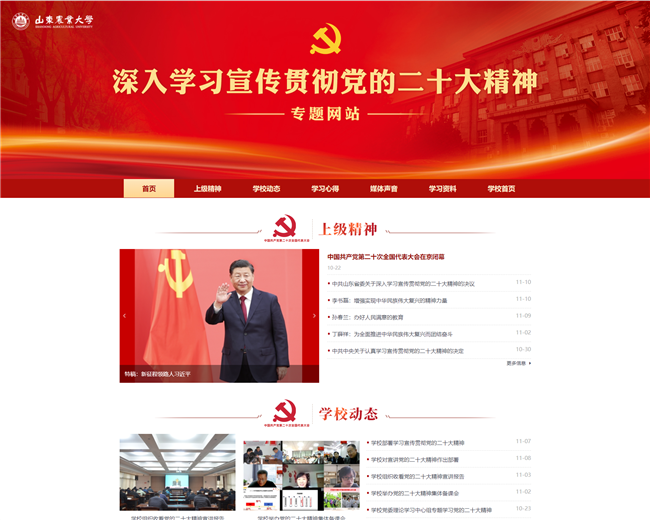 专题网站共设置上级精神、学校动态、学习心得、媒体声音、学习资料等五个板块。上级精神板块重点展示党的二十大报告、习近平总书记系列重要讲话精神和上级关于贯彻落实党的二十大精神的通知要求;学校动态板块集中展示各单位各部门学习宣传贯彻党的二十大精神的生动实践和突出成效;学习心得板块集中展示学校广大党员干部和师生员工结合工作实际谈体会、说心得、话发展;学习资料板块提供丰富的电子图书及媒体学习资源,方便学习查阅。