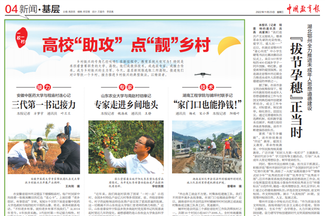 11月23日,《中国教育报》“高校‘助攻’ 点‘靓’乡村”专栏,以“专家走进乡间地头”为题介绍学校学食品科学与工程学院副教授张仁堂服务宁阳县南赵村的典型事迹。