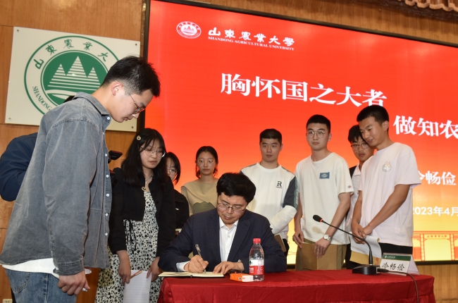 4月18日,党委副书记、校长冷畅俭来到泮河校区,以“胸怀国之大者 做知农爱农的新型人才”为题,为农学院2021和2022级全体本科生讲授思政课。