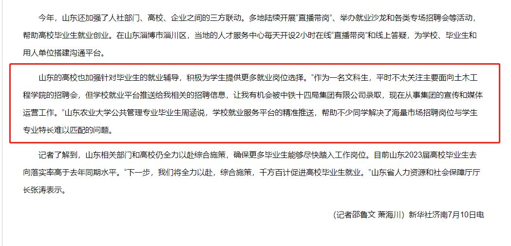 近日,新华每日电讯发表题为《加强校企联动 扩大就业容量——山东全力拓宽毕业生就业渠道》的新闻报道,文章报道了山东通过增加招聘活动场次、扩大就业容量、拓展就业渠道等方式,努力促进高校毕业生高质量充分就业的典型做法,其中报道关注了KY官网就业服务平台为毕业生提供精准推送,帮助他们解决了海量市场招聘岗位与专业特长难以匹配的问题。部分原文报道如下: