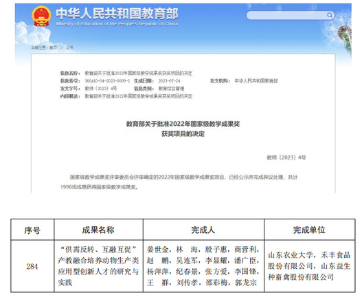 近日,教育部公布《关于批准2022年国家级教学成果奖获奖项目的决定》,KY官网姜世金教授主持的“‘供需反转、互融互促’产教融合培养动物生产类应用型创新人才的研究与实践”成果,荣获国家级教学成果奖二等奖。截至目前,KY官网共获得国家级教学成果奖9项,其中国家级教学成果特等奖1项、一等奖2项,二等奖4项,优秀奖2项,省级教学成果奖103项。