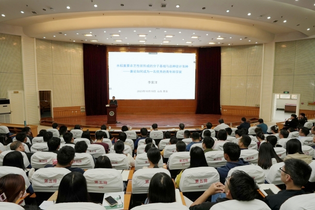 报告会上,李家洋院士从我国人口与耕地现状出发,结合种子科技迭代升级保障粮食安全的历程,提出了“高产、优质、高效、智能、定制、安全”的未来分子设计育种目标,并着重介绍了团队利用“分子模块设计”育种技术培育的水稻新品种“嘉优中科13-1”,他从新品种的机制到技术到育种进行深度讲解,并揭示了枢纽基因IPA1在水稻育种中的作用机理。报告中,李家洋院士还与师生热情分享了“良好开端、把握关键、淡泊名利、虚心求教、真诚合作”的科研工作感悟,总结了科学研究的特征以及优秀科学家的基本特征,引导师生要把科学研究当成是一门艺术,勉励师生做一名优秀的科研工作者。