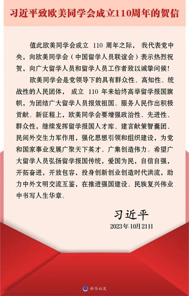 10月21日,欧美同学会成立110周年庆祝大会在京举行。中共中央总书记、国家主席、中央军委主席习近平发来贺信,充分肯定了欧美同学会作出的积极贡献,深刻阐明了欧美同学会的使命任务,对广大留学人员提出殷切期望,为做好新时代留学人员工作提供了根本遵循。