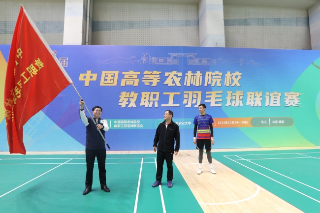 闭幕式上,冷畅俭与廖允成交接会旗。第十二届中国高等农林院校教职工羽毛球联谊赛将由山西农业大学承办。