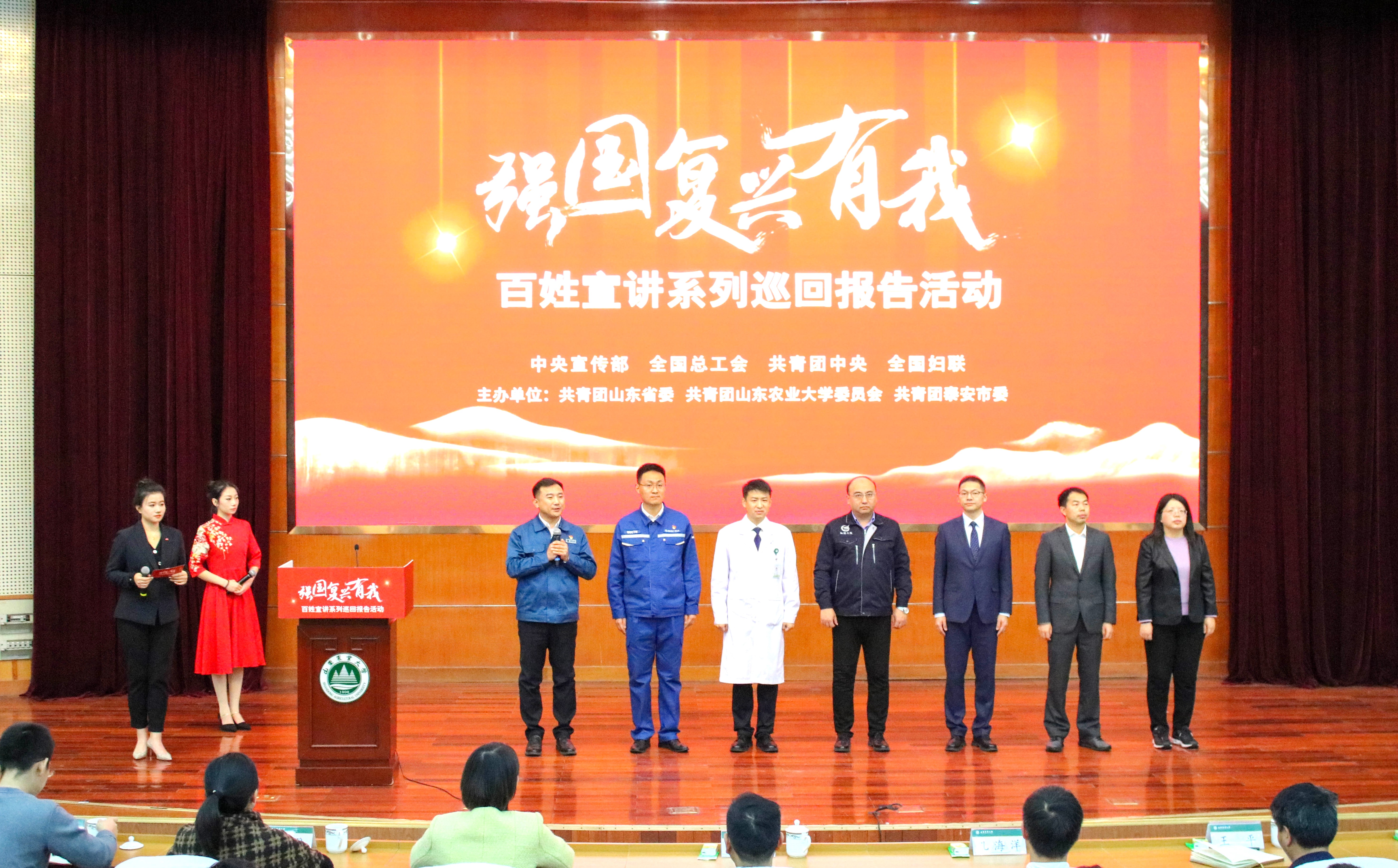 宣讲会上,团中央青年讲师团讲师、广东省团校马克思主义学院院长林楠作题为《非凡十年建功有我强国复兴奋斗有我》的主题宣讲,深情讲述青年建功立业的奋斗身影,深刻诠释“强国复兴有我”的时代内涵。中国船舶集团有限公司第七〇一研究所上海分部副主任、高级工程师黄武刚带来主题宣讲《用赤诚青春铸“利舰” 驰骋祖国万里海疆》,描绘了新时代中国青年奋楫争先,逐梦“星辰大海”的青春篇章。“今天,我们身处新时代,面对历史之问、时代之问、未来之问,我们的使命是什么?”团中央青年讲师团讲师、杭州师范大学马克思主义学院党委副书记应维华以《强国路上书写担当与使命》为宣讲主题,带领青年一同思考和践行强国路上的使命和担当。团中央青年讲师团讲师、哈尔滨飞机工业集团有限责任公司15车间数控铣工高级技师秦世俊结合自身成长经历,以《誓让中国制造更具话语权》为题,用“热爱、机遇和分享”三个关键词,生动展示了基层一线产业工人的梦想奋斗史。聊城市第三人民医院团委副书记,团中央青年讲师团成员白迪,团十九大代表,山东港口青岛港全自动化集装箱码头 AGV 主管张常江,国网济南供电公司电缆运检一班班长姜涛,分别进行了精彩分享。
