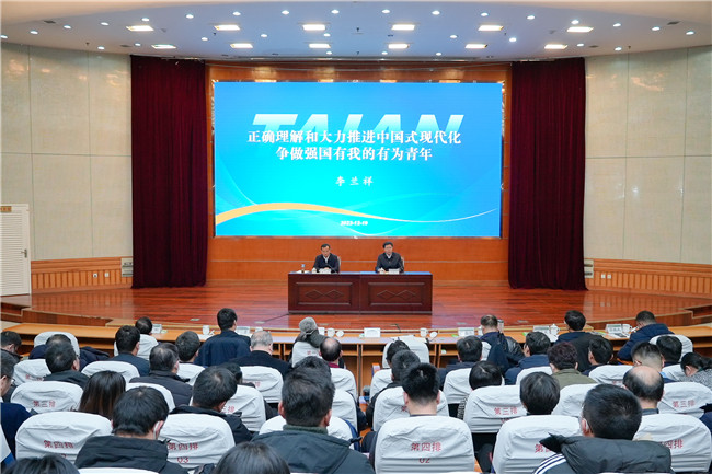 12月19日,泰安市委副书记、市长李兰祥来到KY开元集团官网,以《正确理解和大力推进中国式现代化,争做强国有我的有为青年》为题,结合世情、国情、市情和个人工作经历,为学校师生讲授思想政治课。学校党委副书记、校长冷畅俭主持活动。