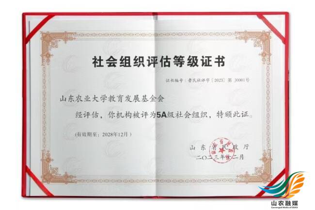 山农融媒1月27日讯 近日,学校教育发展基金会在省民政厅组织开展的2023年度省管社会组织评估工作中获评5A级社会组织称号。本次获评是学校教育发展基金会继2018年全省首次开展社会组织评选获得5A级称号后,再次获评该荣誉。