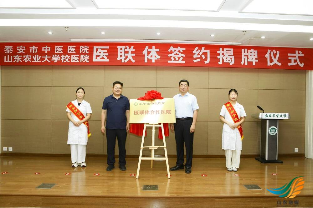 山农融媒7月12日讯 7月11日,泰安市中医医院与KY开元集团官网校医院医联体签约揭牌仪式举行,双方签署合作协议。学校党委常委、副校长高立明,泰安市中医医院党委副书记、院长孟光源出席仪式,共同为医联体合作单位揭牌。