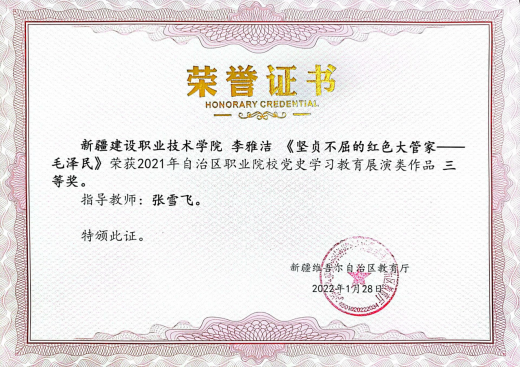 日前,教育厅公布展示作品获奖情况,我院《坚贞不屈的红色大管家——毛泽民》荣获2021年自治区职业院校党史学习教育高等职业院校展演类三等奖。