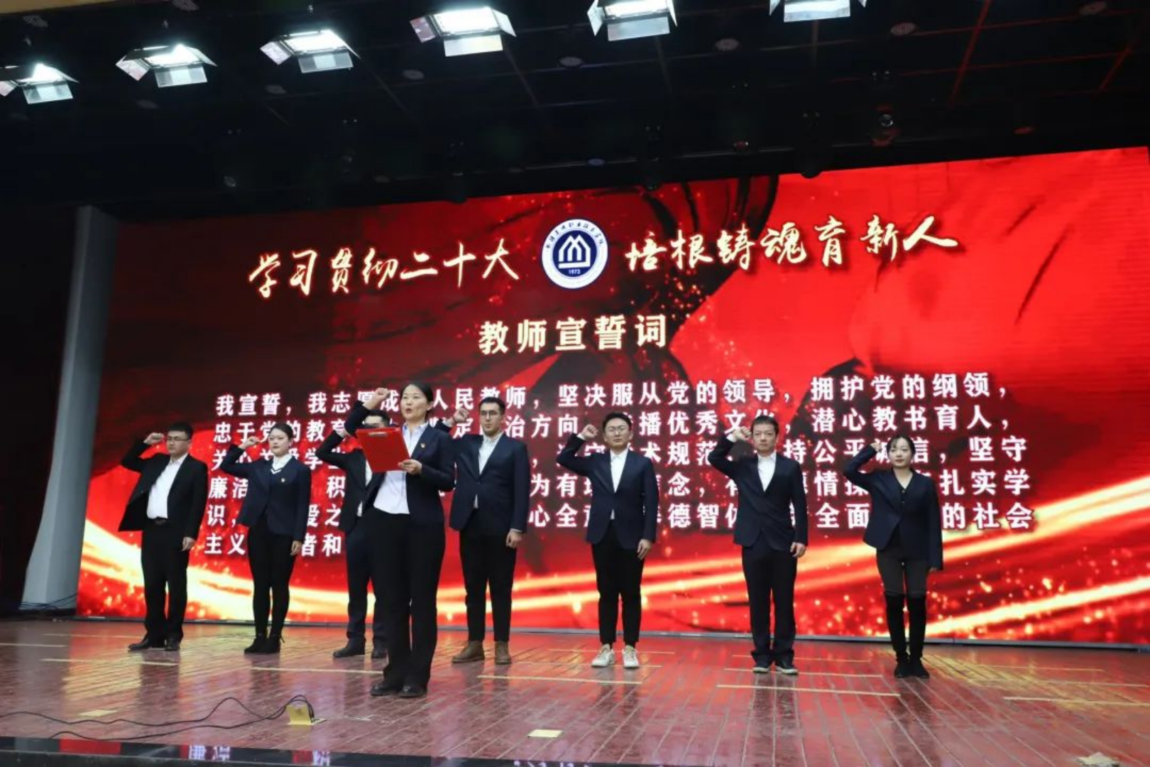 教务处处长张英带领学院2022年新进教师宣誓,大家举起右手,握拳宣读人民教师誓词:“我宣誓:我志愿成为人民教师,坚决服从党的领导……”,坚定自信、铿锵有力的宣誓声在会场回荡,表达了每一名新教师成为一名优秀教师的决心,展现了新一代青年教师的青春与活力。