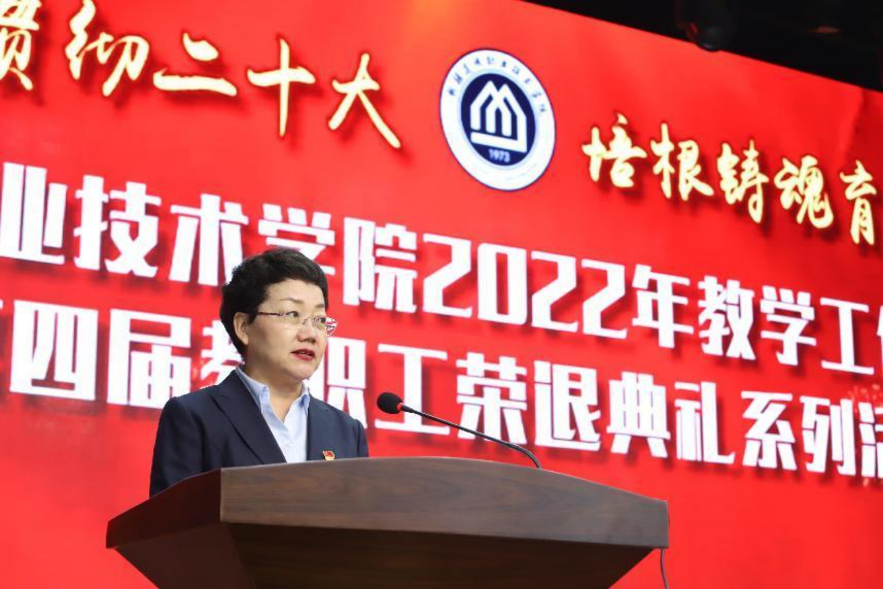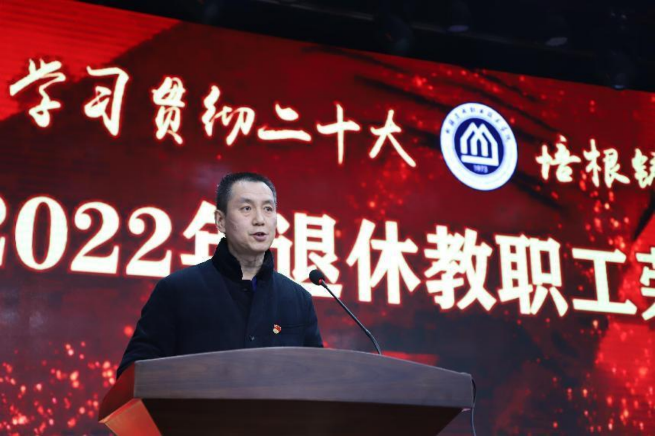 在2022年退休教职工荣退仪式上,党委委员、副院长石建平宣读2022年退休教职工有关文件。