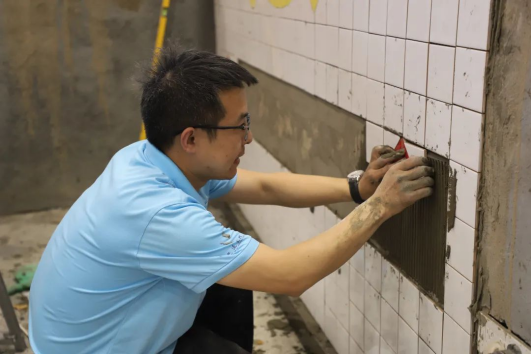 我院的陈立翔和阿里木·买买提参加了这个项目的比赛。瓷砖贴面项目要求选手在7小时内将白色方块瓷砖贴到墙面,其中要嵌入红色“2023”字样瓷砖和黄色党徽图案瓷砖,瓷砖的造型切割和贴面皆由选手独立完成。这一技术广泛应用于家庭和公共设施的装修,就业前景广阔。今年大三的陈立翔已经在企业实习,他通过层层选拔,最终代表学院参赛,他的测量尺上写着“如果成功有捷径那就是踏实勤奋”。瓷砖贴面是一个考验体力耐力的项目,陈立翔和同伴每天都“泡”在实训室,他说学校的后勤保障让参赛选手没有后顾之忧,切割的锯齿、瓷砖价格都不便宜,但是他们从来没有为这个操过心。