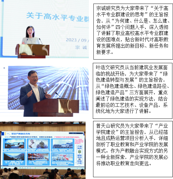 会议邀请了中国工程院王复明院士、清华大学马智亮教授、中国教育科学研究院职业与继续教育研究所研究员宗诚博士、教育部职业教育发展中心副主任曾天山教授、中建集团首席专家和特聘研究员叶浩文5位专家做了会议主题的精彩报告。
