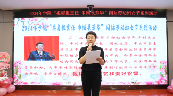 建功新时代,奋进新征程。学院党委副书记、副院长、妇委会主任马桂珍向全体女教职工致以节日的问候,她充分肯定了我院女教职工讲政治、顾大局,尽责任、敢担当,在学院事业发展和建筑人才培养中奉献的巾帼力量,也感谢大家辛勤的工作和任劳任怨的付出。希望我院女教职工积极响应习近平总书记在两会期间所强调的:“希望广大妇女振奋龙马精神,发挥半边天作用,为推进中国式现代化作出巾帼贡献。”以这份信任和期望为动力,继续在各自的岗位中发光发热,谱写建院高质量发展新篇章。