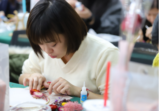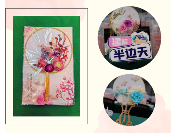 团扇摇摇,美人袅袅。作为中华传统手工艺品,团扇有一种别具诗意的情致,可扑流萤可摇微风。紧接着手工老师介绍了团扇的文化背景及制作方法。大家纷纷拿起手中的材料跃跃欲试,在空白扇面上摆放着各种永生花进行造型设计,从构图布局到色彩搭配,再到粘贴定型,大家边制作边交流,现场气氛十分活跃。一朵朵干花、一片片绿叶在小小的团扇上展现出了独特风采,原本空空如也的团扇也变得花团锦簇,每一扇都那么别具风情。大家纷纷手持作品合影,将最美的时刻定格,记录这一刻的芳华。