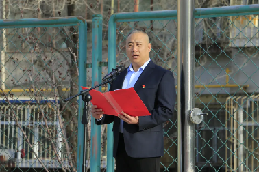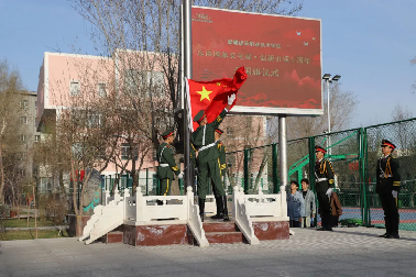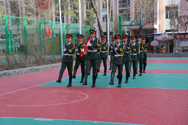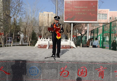 乌鲁木齐市公安局高新区分局银川路派出所民警以及在家院领导和全体师生一起参加升国旗仪式。