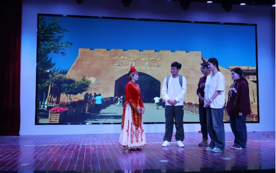 工程管理学院党支部学生表演的情景剧《普通话之旅·新疆之韵》,讲述了导游阿斯木古丽,努力学习国家通用语言,向游客们介绍大美新疆,用普通话这把钥匙,打开了与广阔世界对话的大门。