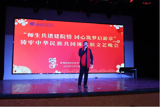 时光荏苒,岁月如梭,在这辞旧迎新的美好时刻,12月31日下午,学院“师生共谱建院情 同心筑梦启新章”——铸牢中华民族共同体意识文艺晚会在建材校区隆重举行,学院党委副书记、院长党进,党委副书记、副院长马桂珍,党委委员、纪委书记赵玉,副院长余冬贞,及高新区(新市区)委政法委、党委宣传部意识形态和审读工作办公室,高新区(新市区)维稳指挥中心、银川路街道党工委、杭州路街道、杭州路派出所、上八家户社区、西八家户社区等有关领导出席,600余名师生参加了活动。 晚会由舞蹈、朗诵、小品、舞台剧、手势舞、歌曲(独唱)、情景舞蹈、舞蹈串烧等14个节目组成,200余名教师和30余名学生同台演出,多种艺术展现形式轮番上演,融合中华优秀传统文化与现代文化,充分展示了我院丰富多彩的校园文化生活,营造出“以美育人、以文化人”的浓厚氛围,为观众带来一场视听盛宴。