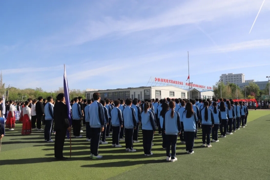 入场式结束后,全体师生肃立,升国旗、行注目礼并唱国歌。在庄严的国歌声中,五星红旗冉冉升起,迎风飘扬。