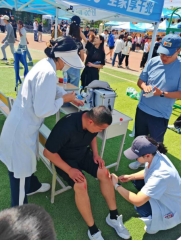 距离开幕还有不到一小时,城建校区总配电室突发停电故障。维修中心凭借丰富的经验,快速响应、高效处置,快速恢复供电,保障运动会顺利进行。医务室在田径场、球类赛场、检录处设置医疗驻点,同步派出流动巡诊小队,各点位统一配备AED除颤仪、急救包、折叠担架等专业设备和常备药品。设置“赛后恢复站”,为运动员提供冰敷、肌效贴等专业服务。餐饮中心打造餐饮保障“能量站”。食堂科学制定营养菜单,提供富含蛋白质的餐食、防暑降温绿豆汤和水果。