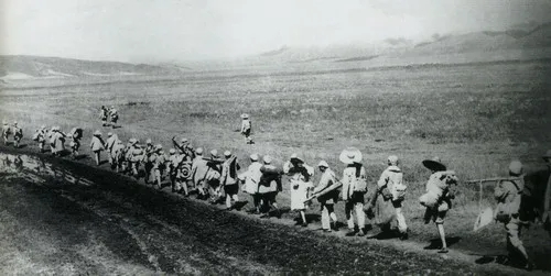 (1949年10月12日,二、六军分陆地和空中数陆大军向新疆开始了气势磅礴的大进军。图为行进在戈壁沙漠的二军部队。图片来源:新疆生产建设兵团新闻办公室)